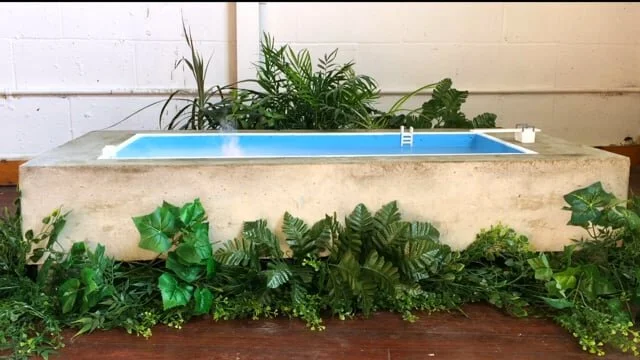 Concrete, water, LED lights, smoke machine, wood and plants.